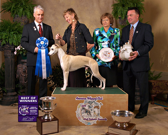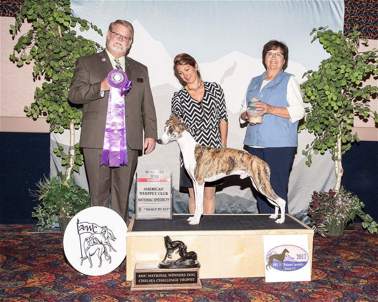 JB was winners dog at the 2017 American Whippet Club National Specialty under breeder-judge Harold “Red” Tatro, lovingly shown by his breeder-owner-handler Kelly! He is a very accomplished boy who also enjoyed lure coursing.