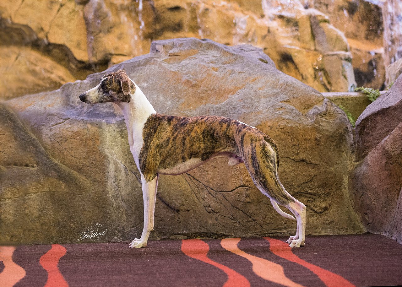 Lizzy is the foundation to Festiva Whippets. We aquired her 2 months after bringing home her brother, Ch. Oxford’s Stetson for Kelly. During all the visits with Dianne I fell in love with Lizzy’s beautiful half face and feminine looks. Lizzy did not like showing so we were lucky to get her finished but she excelled in the whelping box. Her first litter produced Multi-BISS Ch. Festiva’s Knickerbocker and his sister, Multi Group winning Ch. Oxford Festiva Berryetta.